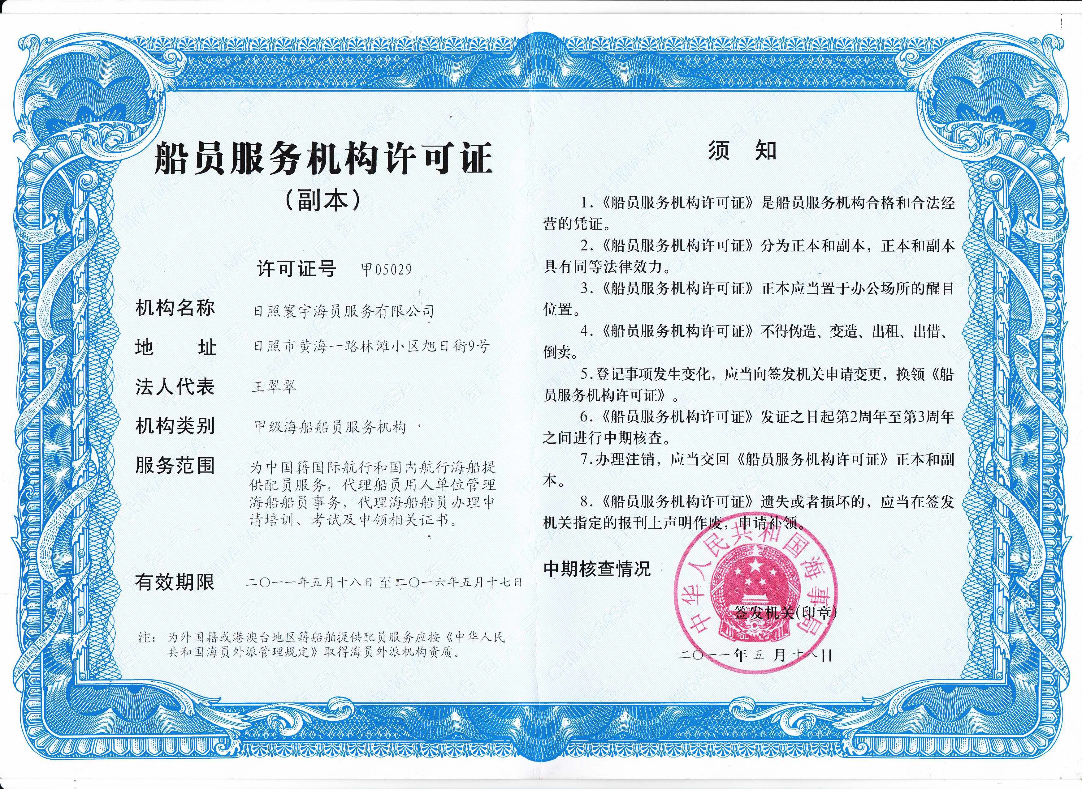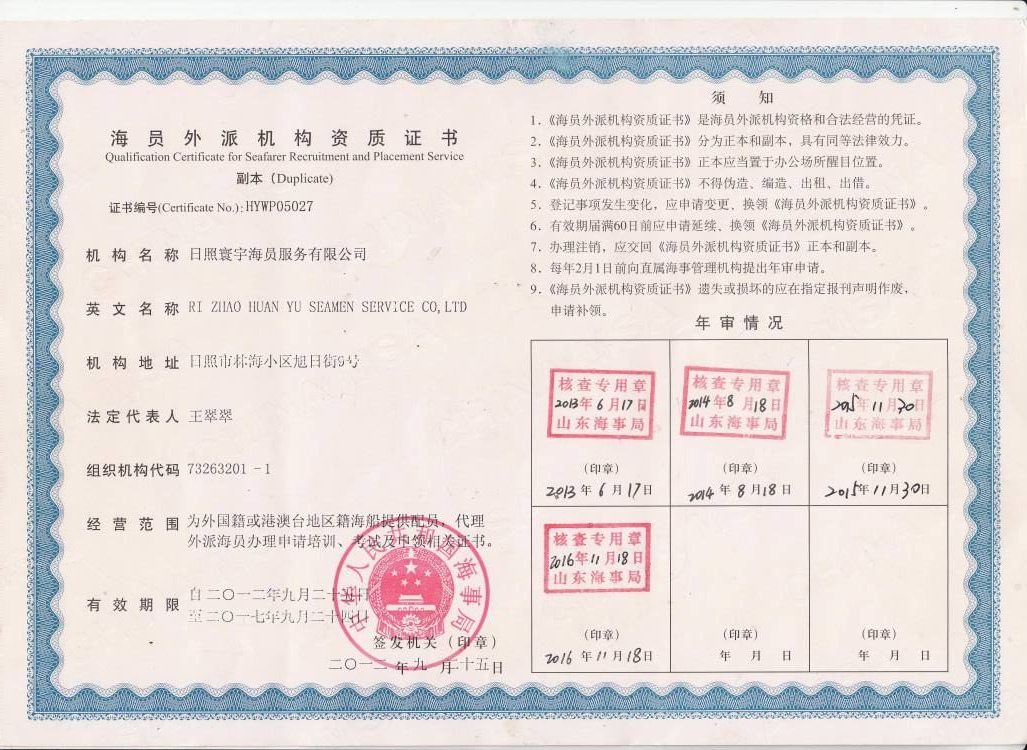 日照寰宇海员服务有限公司成立于1993年,2012年9月取得海员外派机构资质证书,是日照最早的一家经中华人民共和国海事局批准的海员外派机构,也是业内较早的从事海员外派业务的公司之一。至今已经走过了三十多年的发展历程。公司于公司从无到有,从小到大,目前已发展成为国内一家特色鲜明、信誉优良且颇具规模规模的海员劳务外派公司。公司目前旗下拥有日照总公司、厦门分公司、深圳分公司、武汉分公司、香港子公司。